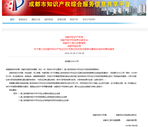 成都普思生物科技股份有限公司自2014年成為成都市知識產(chǎn)權(quán)試點企業(yè)以來,公司不斷進取、日益壯大,努力實現(xiàn)產(chǎn)、學(xué)、研結(jié)合,提高了自主知識產(chǎn)權(quán)的數(shù)量和質(zhì)量,加快了知識產(chǎn)權(quán)的運用轉(zhuǎn)化,在知識產(chǎn)權(quán)工作制度的完善、知識產(chǎn)權(quán)工作人才隊伍的壯大、專利的申請、轉(zhuǎn)化實施和相關(guān)產(chǎn)品銷售等方面都取得了豐碩的成果。在2016年10月成都市知識產(chǎn)權(quán)局組織的復(fù)核及驗收工作中,成功通過驗收,驗收考核結(jié)果為“優(yōu)秀”。