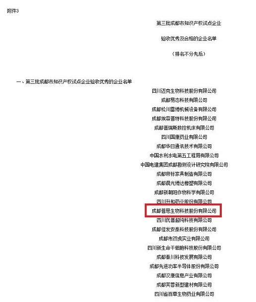 熱烈祝賀普思生物成都市第三批知識產(chǎn)權(quán)試點企業(yè)驗收優(yōu)秀
