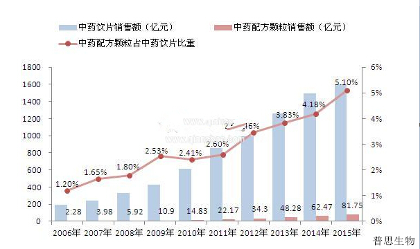 近年來中藥配方顆粒保持快速增長態(tài)勢,2006-2015年,中藥配方顆粒全國銷售額年均復(fù)合增速高達(dá)48.84%,遠(yuǎn)高于同期中藥飲片26.7%的增長。