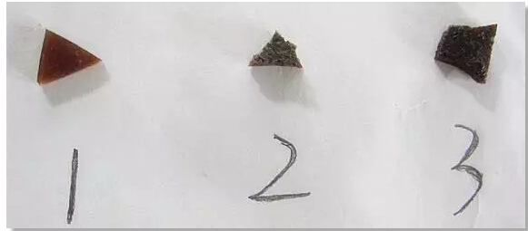 按傳統(tǒng)蟾酥鑒別法,若遇水起泡沫則是蟾酥正品,則可初步推斷樣品2是偽品,樣品1、3疑似正品,為了進一步證明推斷是否正確,來試試顯色法。