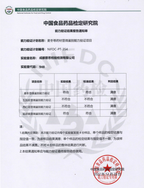 近日,成都普思生物科技股份有限公司旗下子公司“成都普思檢驗檢測有公司”通過了由中檢院于2022年組織的“麥冬等藥材顯微鑒別能力驗證項目”、“HPLC法測定何首烏中二苯乙烯苷的含量”兩項能力驗證,結果均為“滿意”。