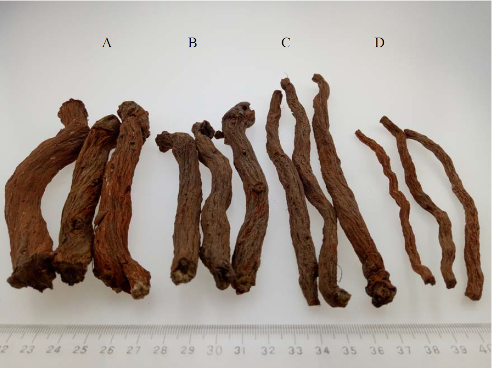 A——川丹參特級(jí);B——川丹參一級(jí)C——川丹參二級(jí);D——川丹參三級(jí)