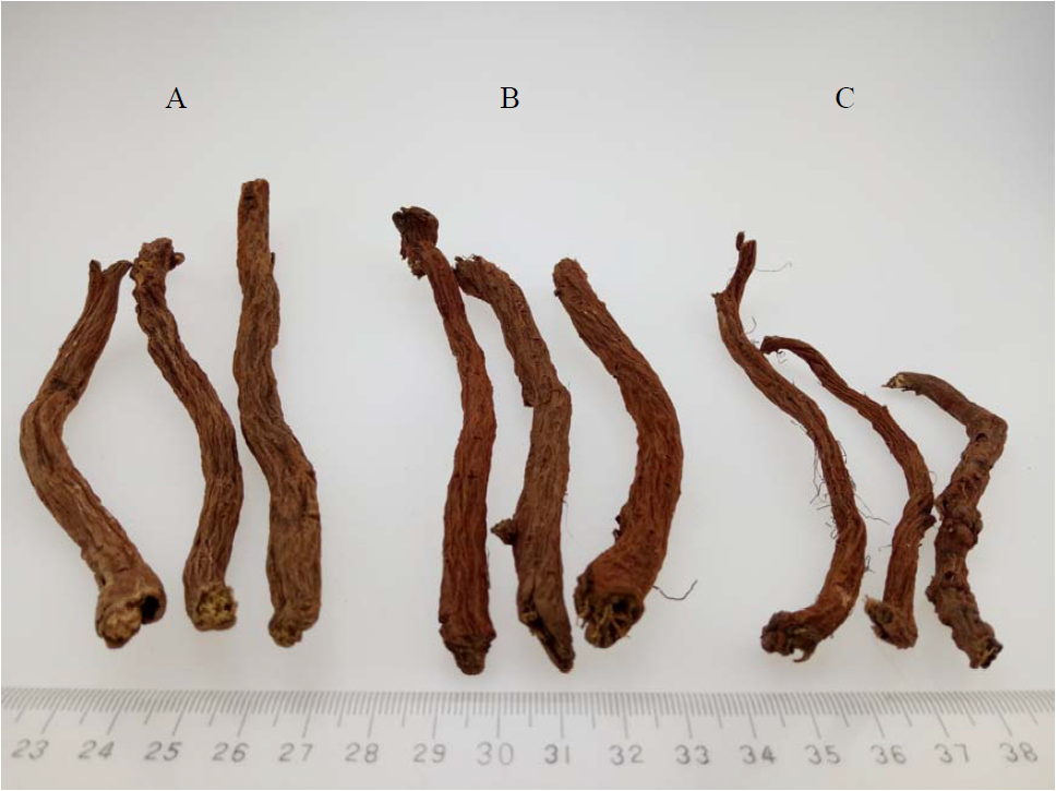A——山東丹參一級(jí);B——山東丹參二級(jí);C——山東丹參統(tǒng)貨