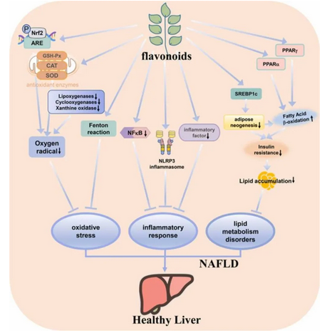 雖然NAFLD是一種肝臟相關(guān)疾病,但心血管疾病和惡性腫瘤是NAFLD患者死亡的主要原因,這意味著NAFLD的治療需要整體治療。研究發(fā)現(xiàn)黃酮類化合物能夠通過改善氧化應(yīng)激、脂質(zhì)代謝和全身炎癥來減輕NAFLD的進(jìn)程。
