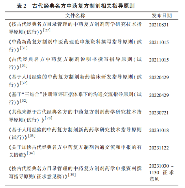 2019年12月以來新型冠狀病毒肺炎在全球蔓延,在這次抗擊疫情過程中,中醫(yī)藥通過臨床篩選出的有效方劑發(fā)揮了重要的作用。抗疫期間,國家藥監(jiān)局采取早期介入、研審聯動等措施,邊審評、邊研究、邊總結,探索優(yōu)化中藥注冊分類,批準了多個古代經典名方中藥復方制劑:2021 年 3 月 2 日,源自抗疫“三方”的清肺排毒顆粒、化濕敗毒顆粒、宣肺敗毒顆粒通過特別審批程序上市;2022 年10 月 9 日,散寒化濕顆粒上市。為促進古代經典名方制劑研發(fā),推進疫情防控成果轉化,藥審中心將審評的經驗進行總結,制定了古代經典名方復方制劑的相關指導原則(表 2),加強技術標準體系建設,全程加速相關品種的研發(fā)、申報和審評進度。2022 年 12 月 28 日首個中藥3. 1類制劑苓桂術甘顆粒獲批上市,2023 年以來,枇杷清肺顆粒、濟川煎顆粒、一貫煎顆粒和芍藥苷草顆粒等多個中藥3. 1類品種獲批上市。