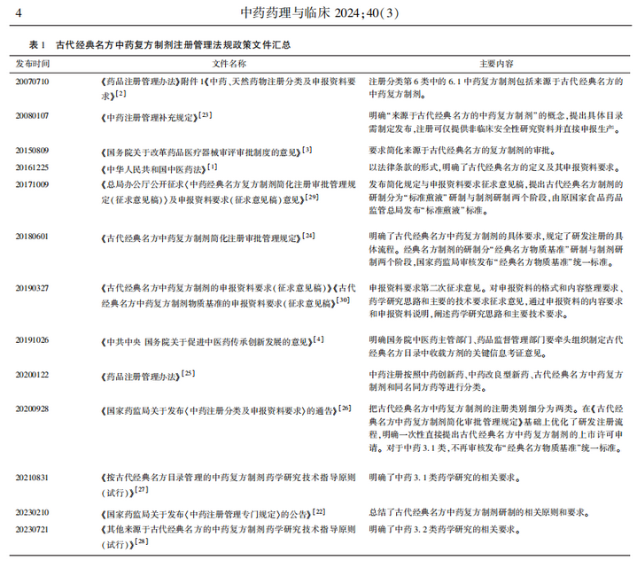 2015年《國務院關于改革藥品醫(yī)療器械審評審批制度的意見》明確要求“簡化來源于古代經典名方的復方制劑的審批”。2016 年《中華人民共和國中醫(yī)藥法》(以下簡稱《中醫(yī)藥法》) 明確“古代經典名方,是指至今仍廣泛應用、療效確切、具有明顯特色與優(yōu)勢的古代中醫(yī)典籍所記載的方劑?!?“生產符合國家規(guī)定條件的來源于古代經典名方的中藥復方制劑,在申請藥品批準文號時,可以僅提供非臨床安全性研究資料。具體管理辦法由國務院藥品監(jiān)督管理部門會同中醫(yī)藥主管部門制定?!?這一立法規(guī)定大大加快了該類中藥復方制劑研究申報注冊的相關進程,特別是相關注冊管理法規(guī)政策文件的出臺。見表1。2018年國家藥監(jiān)局發(fā)布了《古代經典名方中藥復方制劑簡化注冊審批管理規(guī)定》,明確“經典名方制劑的研制分‘經典名方物質基準’研制與制劑研制兩個階段”,國家藥監(jiān)局發(fā)布統(tǒng)一“經典名方物質基準”,可以分兩個階段提交申報資料。2020年新版《藥品注冊管理辦法》在中藥注冊分類中新增了古代經典名方中藥復方制劑分類,并在隨后發(fā)布的《國家藥監(jiān)局關于發(fā)布〈中藥注冊分類及申報資料要求〉的通告》中將其細分為“按古代經典名方目錄管理的中藥復方制劑” ( 以下簡稱中藥 3. 1 類)和“其他來源于古代經典名方的中藥復方制劑” (以下簡稱中藥 3. 2 類)兩種情形,明確“注冊申請人一次性直接提出古代經典名方中藥復方制劑的上市許可申請”,“不再審核發(fā)布‘經典名方物質基準’統(tǒng)一標準”,從而進一步簡化了該類制劑的注冊流程。2023年《中藥注冊管理專門規(guī)定》明確了古代經典名方中藥復方制劑“不需要開展非臨床有效性研究和臨床試驗”,并明確了該類制劑注冊管理總體要求、審評模式等。國家藥監(jiān)局藥品審評中心(以下簡稱藥審中心) 分別于2021年和2023年發(fā)布了《按古代經典名方目錄管理的中藥復方制劑藥學研究技術指導原則(試行)》和《其他來源于古代經典名方的中藥復方制劑藥學研究技術指導原則(試行)》,明確了中藥 3. 1 類和中藥 3. 2 類的藥學研究要求。