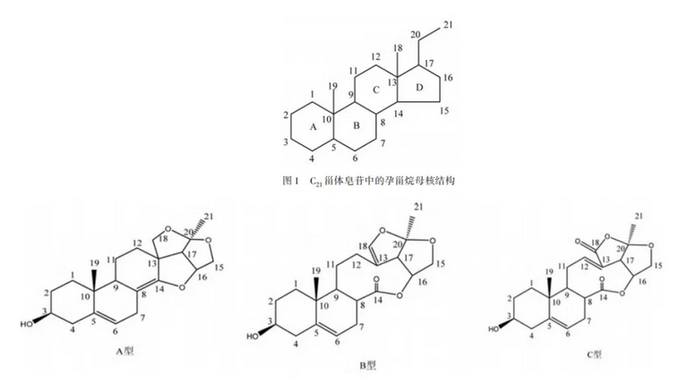 1、甾體皂苷苷元均以孕甾烷(圖1)或其異構體為基本骨架,C、D環(huán)易發(fā)生變形,D環(huán)氧化成3個四氫呋喃環(huán)(A型)或苷元骨架中的六元C環(huán)和五元D環(huán)氧化斷裂成九元環(huán)的飽和內酯(B型)及不飽和內酯(C型);