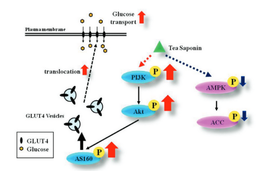2、抗糖尿病作用:茶皂素E1通過激活PI3K/Akt/mTOR信號通路,增加C2C12成肌細胞的葡萄糖攝取能力,改善肌肉能量代謝,降低血糖水平,對于Ⅱ型糖尿病具有潛在的治療作用。