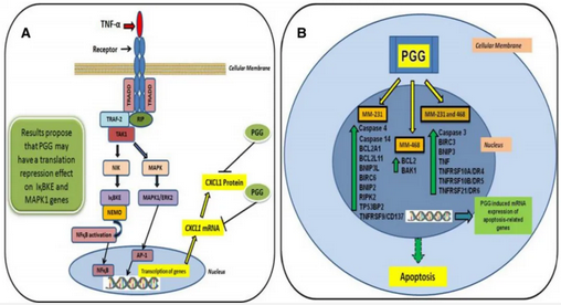 1、抗三陰性乳腺癌(triple-negative breast cancer,TNBC):Mendonca等的研究表明PGG具有抗癌能力,能夠通過(guò)增加TNF和TNF家族受體的表達(dá)來(lái)抑制腫瘤細(xì)胞增殖和GRO-α釋放,并誘導(dǎo)凋亡(圖一)。因此,建議將PGG作為T(mén)NBC的輔助療法,以提高化療效果并防止癌癥進(jìn)展。[2]