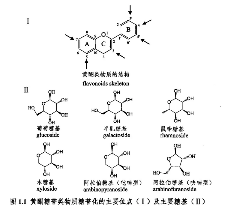 黃酮糖苷主要是由黃酮基本骨架主要位置上的氧化作用所形成的。糖取代基多以氫氧化形式與黃酮碳骨架相連,形成O-糖苷,也有少數(shù)與黃酮A環(huán)上的C原子直接相連形成C-糖苷,如牡荊素、葛根素等。糖基主要包括葡萄糖、半乳糖、鼠李糖、木糖、阿拉伯糖等,且部分糖基有乙?;?、咖啡?;⑾愣辊;](méi)食子?;痊F(xiàn)象。
