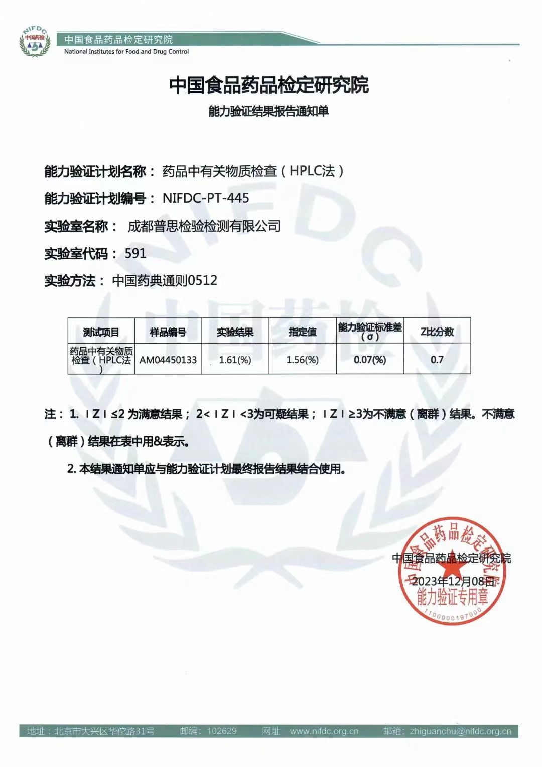 成都普思順利通過中檢院藥品中有關(guān)物質(zhì)檢查(HPLC法)能力驗證