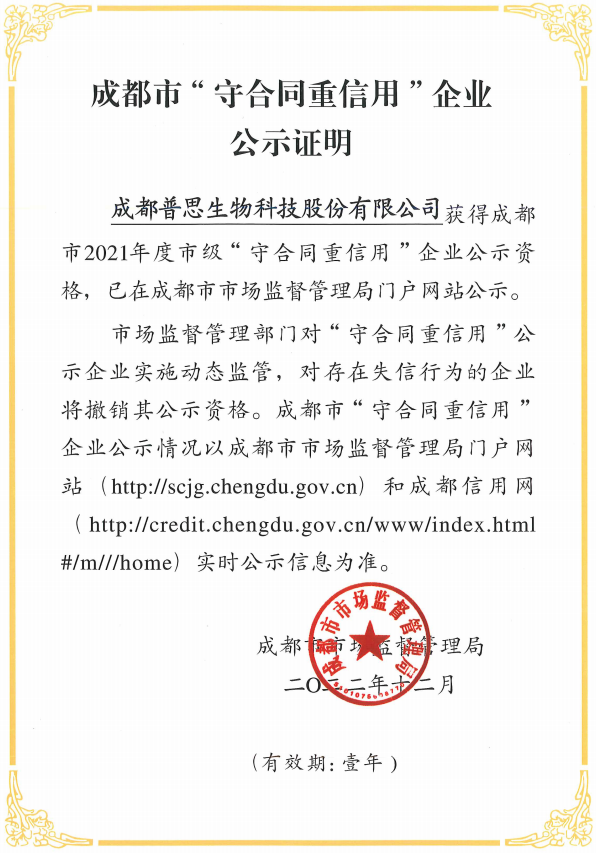 普思生物榮獲2021年度成都市市級(jí)“守合同重信用”企業(yè)稱號(hào)